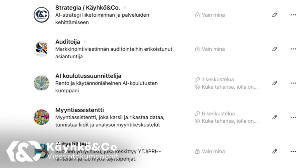 Esimerkiksi itse olen rakentanut CustomGPT-assarin enempivähempi kaikkia toistuvia työtehtäviä varten. Joskus aikaa säästyy neljä tuntia, joskus 10 minuuttia - ja näistä puroista tulee viikkotasolla aikamoinen läjä säästyneitä minuutteja ja tunteja.